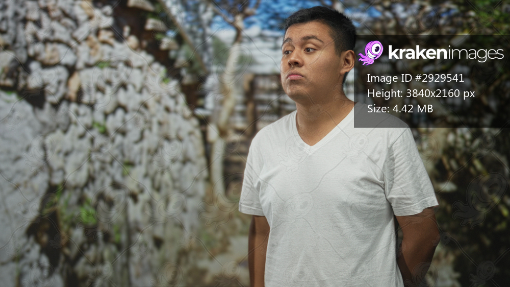 Young hispanic man face looking sideways in forest wearing white t shirt and standing near stone wall steps, hands behind back; quiet contemplation.