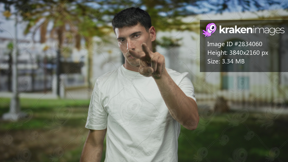 Young hispanic man finger to eyes for watching and finger across throat in green park outdoors; threat.