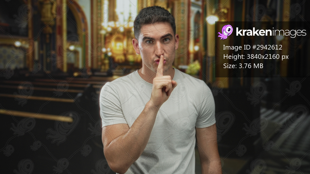 Young hispanic man finger to lips for silence in ornate catholic church aisle wearing white t shirt; quiet reverence.