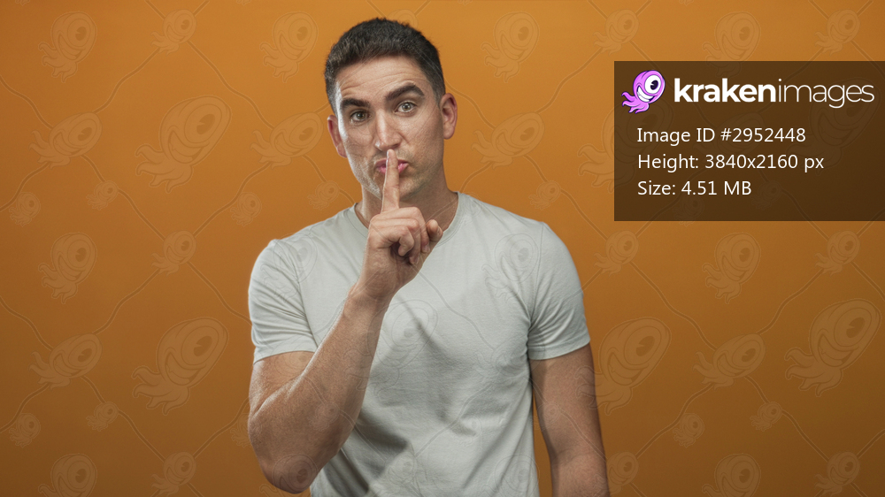 Young hispanic man finger to lips for silence in studio orange set looking at camera, bare hand visible; silence secrecy hush.