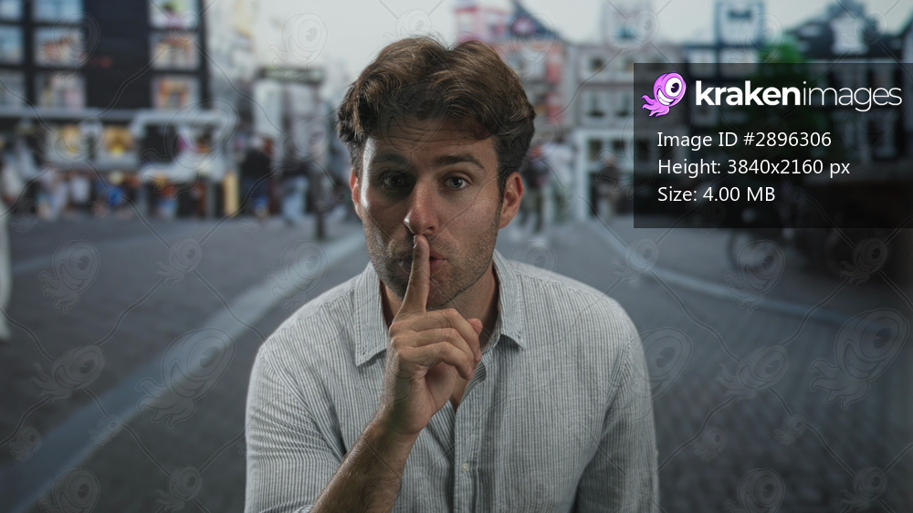 Young hispanic man with finger to lips for silence on a cobblestone city street, wearing a striped shirt and looking sideways toward blurred buildings and bicycles; silence. - Kraken Images