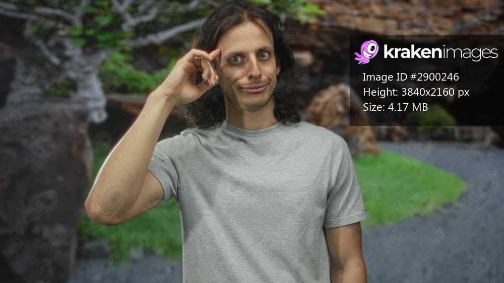 Young hispanic man with finger to temple and long hair wearing gray t shirt in forest path with green foliage; introspection.