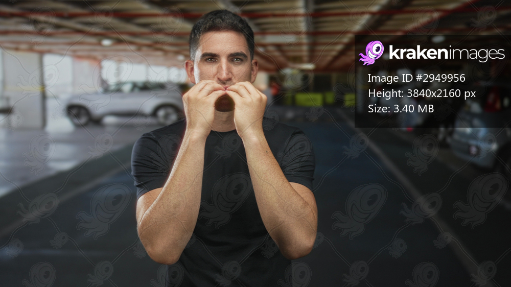 Young hispanic man with fingers to lips making a whistling gesture in indoor parking building; quiet concentration.