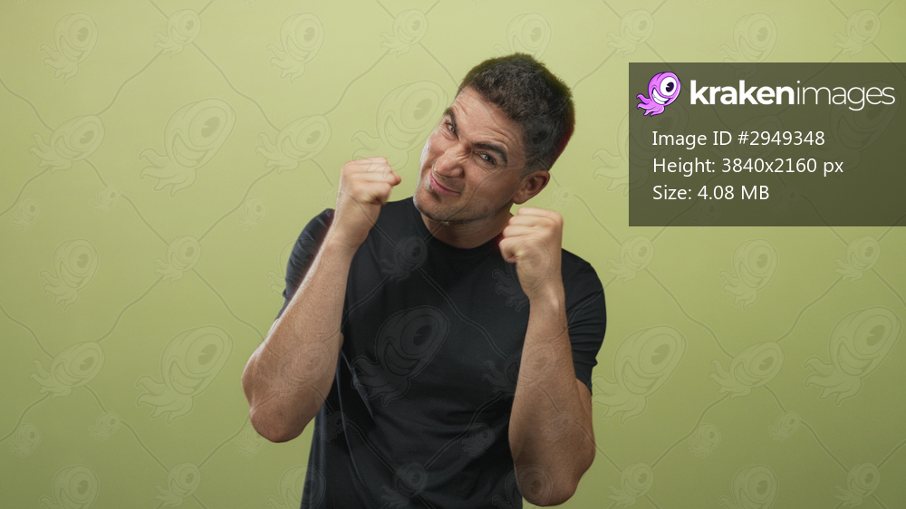 Young hispanic man with fists raised in a boxing gesture in a green studio setting; confidence courage.