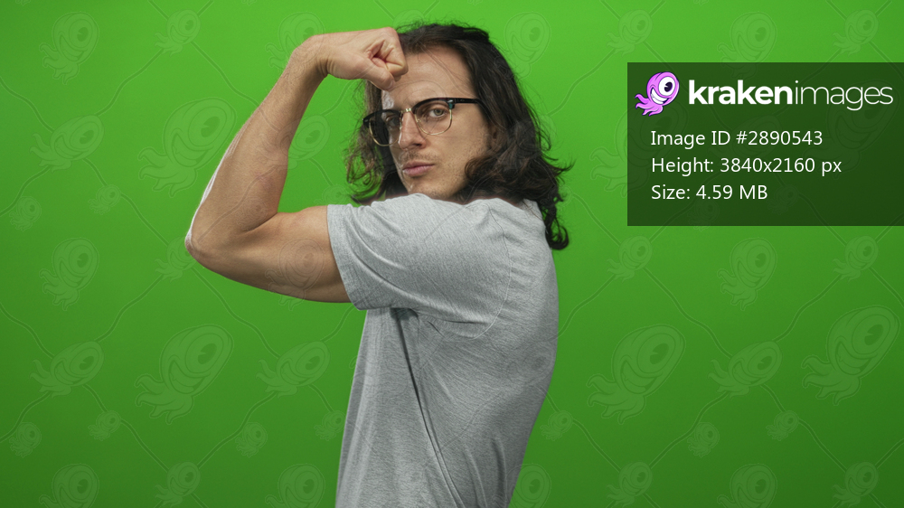 Young hispanic man flexing bicep and forearm in studio with bright green backdrop; confidence strength.