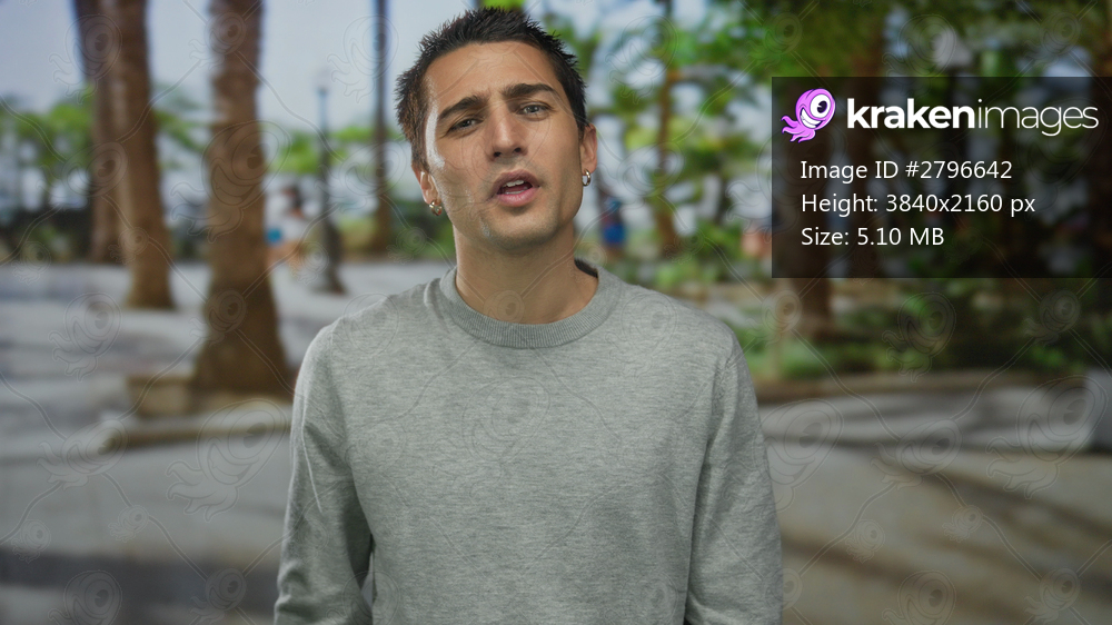 Young hispanic man flipping middle fingers in park amid palm trees with scowling expression; defiance.
