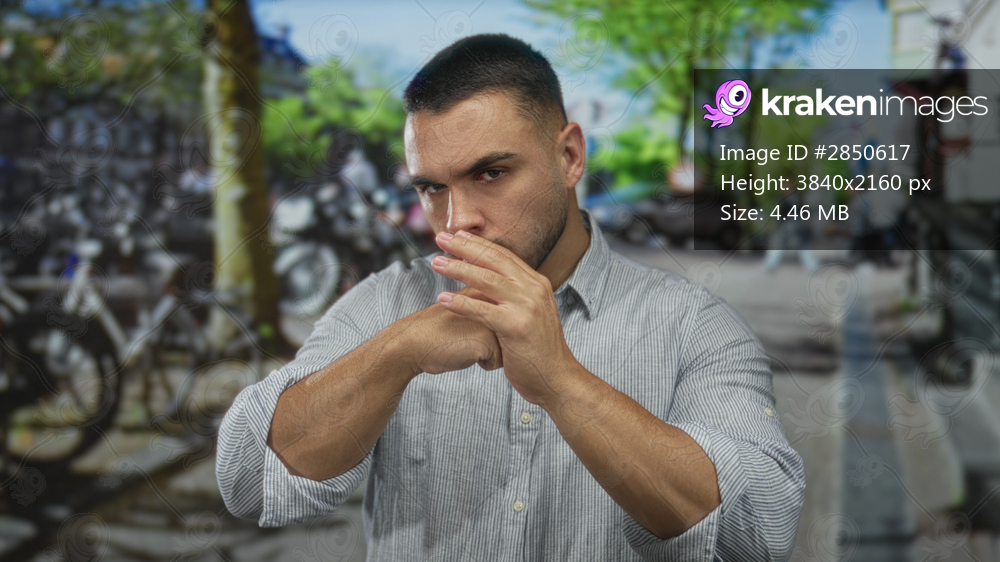 Young hispanic man forcefully punching his open palm on a bustling urban street; anger frustration tension.
