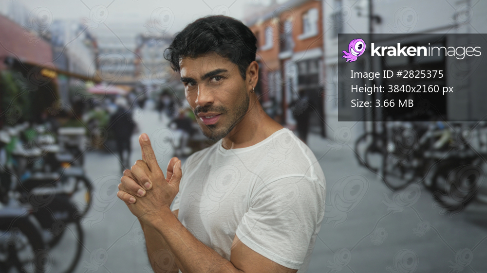 Young hispanic man forming handgun gesture with hands on a crowded urban street, framed by bicycles and storefronts; playfulness.