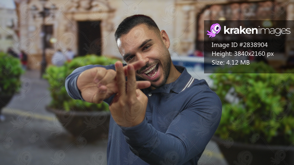 Young hispanic man forming hashtag gesture with fingers on sunlit busy city street; playful social trend.