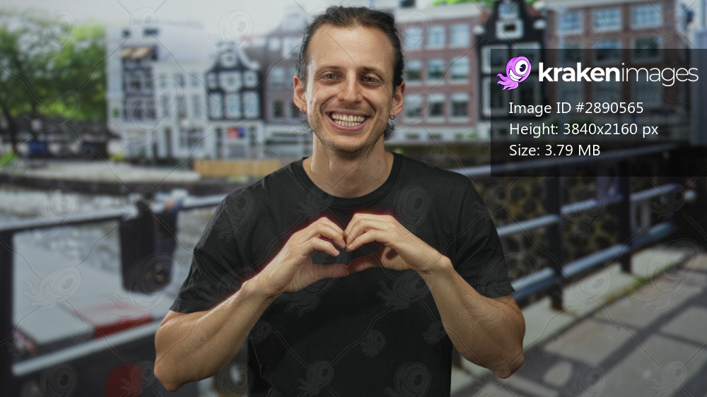 Young hispanic man forms heart with bare hands on amsterdam street by canal railing; love connection.