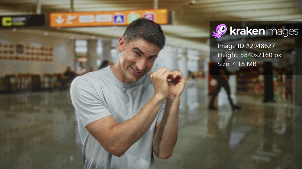 Young hispanic man forms heart with hands and smiles while standing in airport terminal near boarding signs; affection hope.