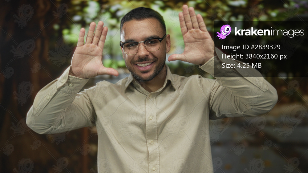 Young hispanic man frames face with hands and smiles gently in a street lined with green trees; creativity joy imagination.