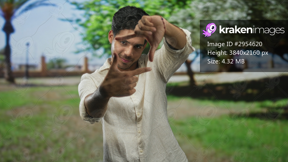 Young hispanic man framing a shot with hands on a street promenade by trees and lamps; playful confidence.