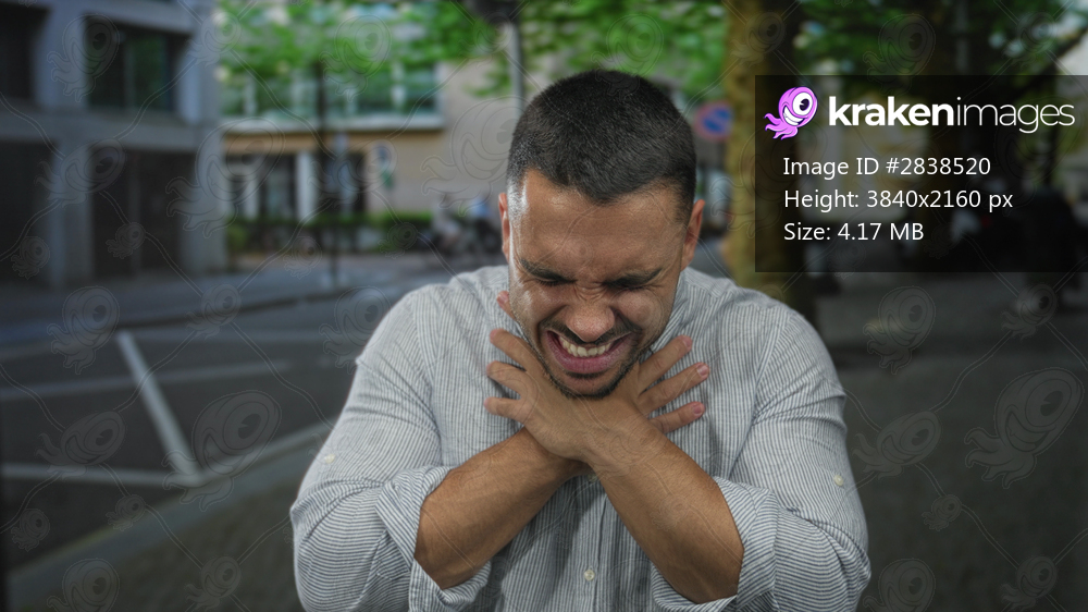 Young hispanic man with furrowed brow and closed eyes clutching throat on urban street corner; distress.