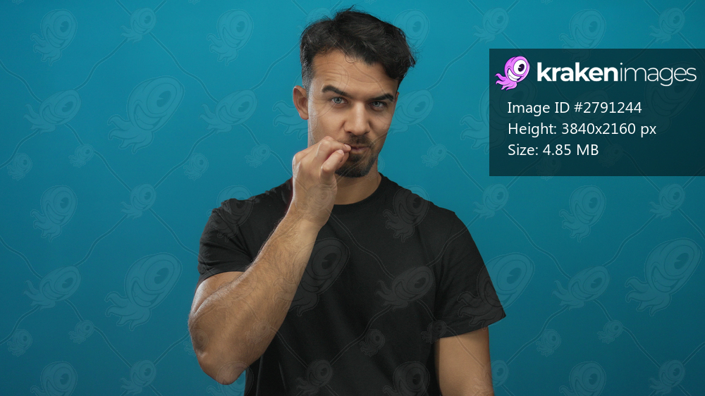 Young hispanic man gestures closing his mouth over isolated blue background expressing silence secrecy or confidentiality with a serious focused expression - Kraken Images