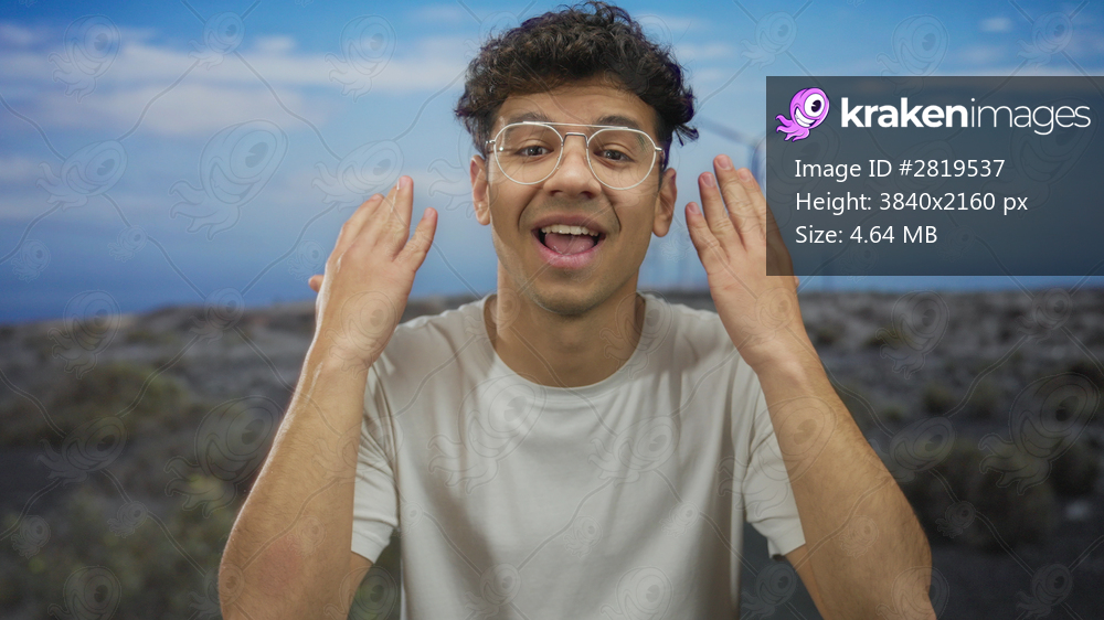 Young hispanic man gestures with hands beside windmill building; renewable energy sustainability optimism.