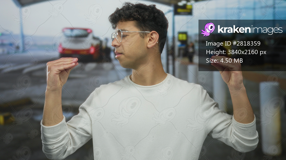 Young hispanic man gestures with hands while speaking at a busy airport terminal gate counter; enthusiasm.