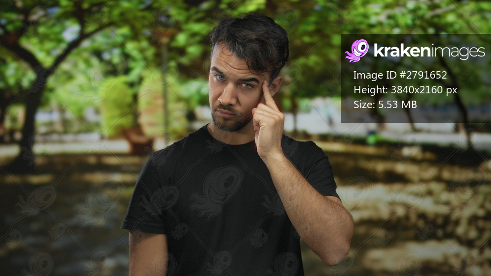 Young hispanic man gestures mindfully in a sunny park surrounded by lush greenery, embodying thoughtfulness and contemplation in an outdoor setting.