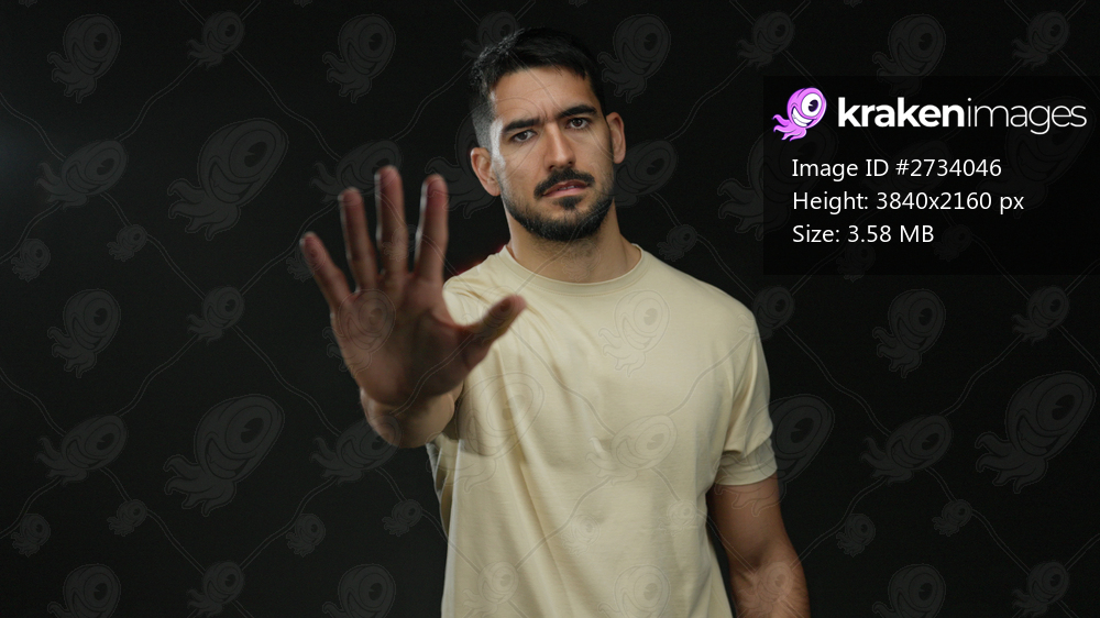 Young hispanic man gestures no with finger in a portrait over an isolated black background conveying disapproval
