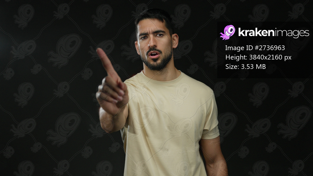 Young hispanic man gestures no with finger in a portrait over an isolated black background conveying disapproval