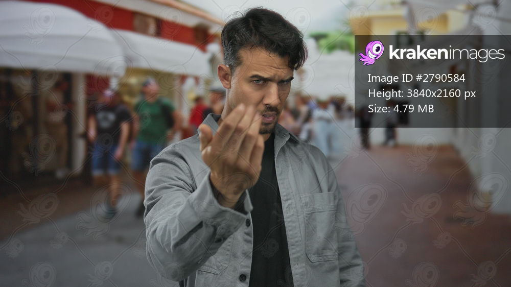 Young hispanic man gestures on a bustling city street, inviting the camera with a confident expression, surrounded by urban outdoor scenery and blurred passersby. - Kraken Images