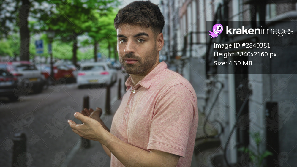 Young hispanic man gestures with open hands on bustling city street beneath green trees wearing pink polo; curiosity.