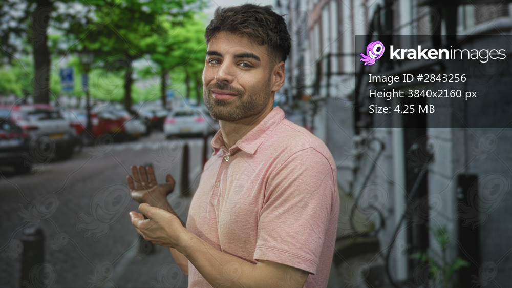 Young hispanic man gestures with open hands on bustling city street beneath green trees wearing pink polo; curiosity.
