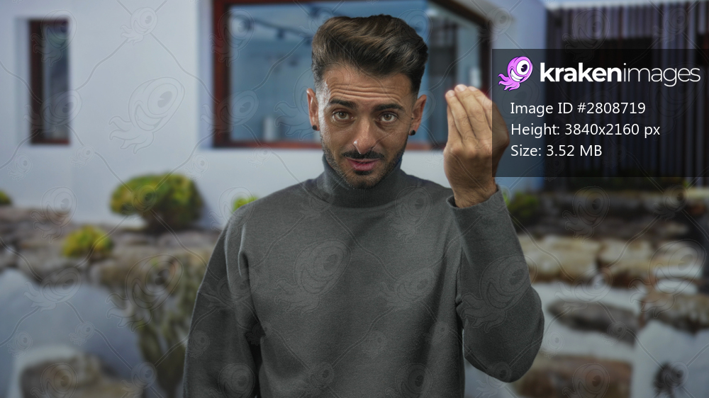 Young hispanic man gestures with pinched hand motion at modern house entrance on quiet city street; curiosity.