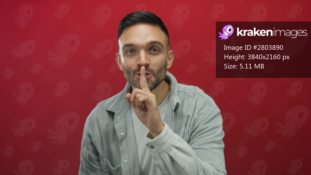 Young hispanic man gestures silence with finger on lips in front of a vibrant red background, expressing secrecy or quiet, wearing a casual shirt and conveying mystery and intrigue. - Kraken Images
