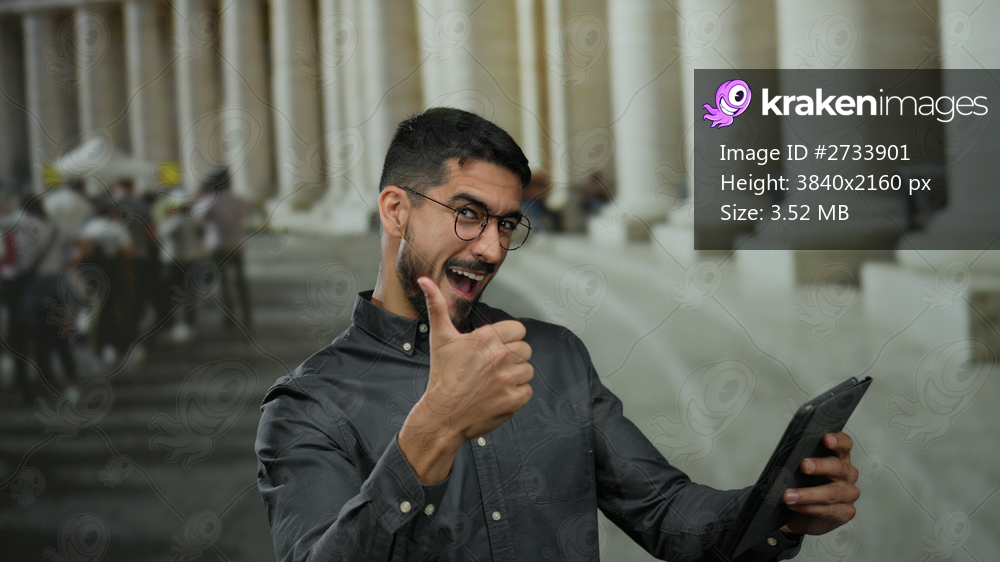 Young hispanic man gestures thumbs up while using tablet outdoors in urban setting.