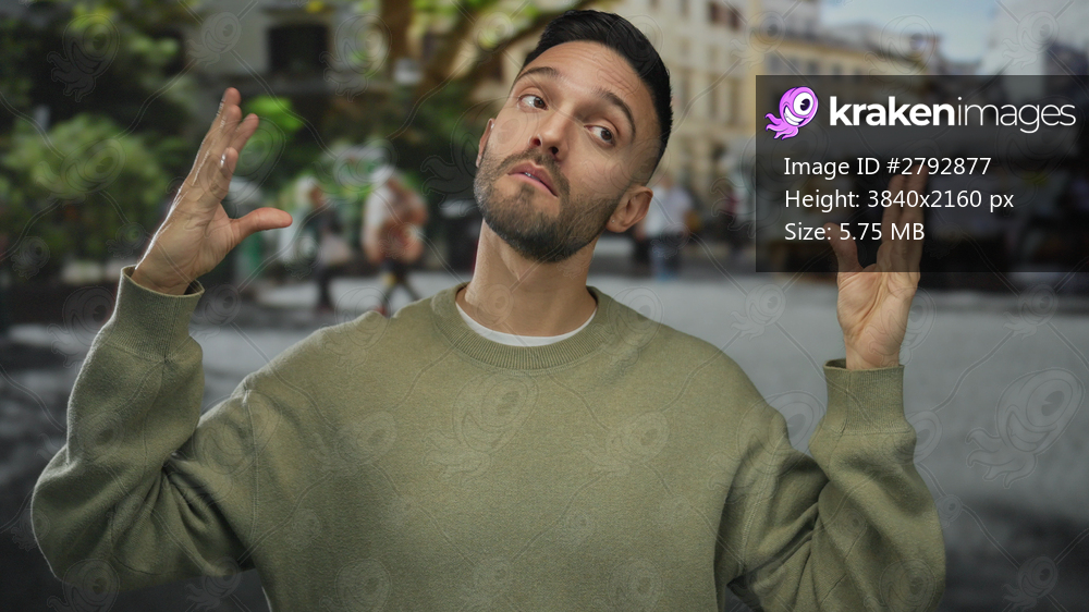 Young hispanic man gesturing animatedly on urban street with people and buildings in the blurred background, conveying expression and emotion outdoors in a vibrant city setting. - Kraken Images