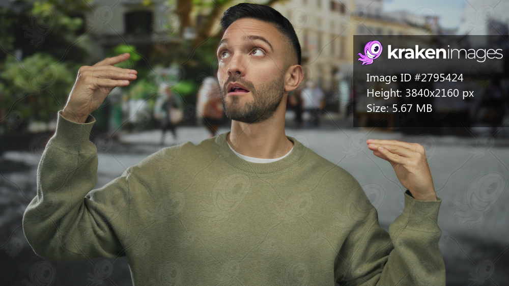Young hispanic man gesturing animatedly on urban street with people and buildings in the blurred background, conveying expression and emotion outdoors in a vibrant city setting. - Kraken Images