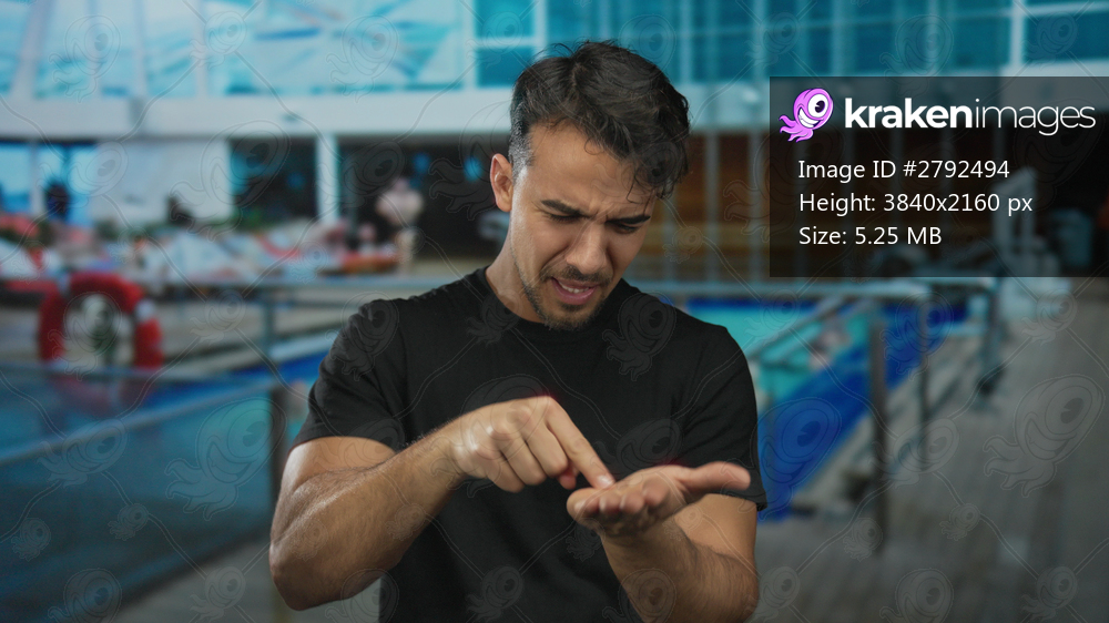 Young hispanic man gesturing for money on a cruise boat deck outdoors, surrounded by a swimming pool area under a clear sky, suggesting summer vacation vibes. - Kraken Images