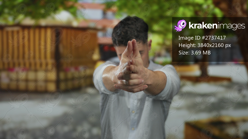 Young hispanic man gesturing with hands mimicking a gun in a sunny park setting surrounded by trees