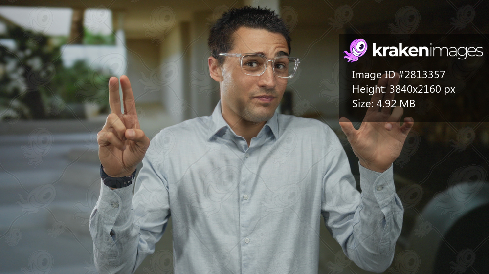 Young hispanic man gesturing indoors with palms up and smiling in modern urban home environment.