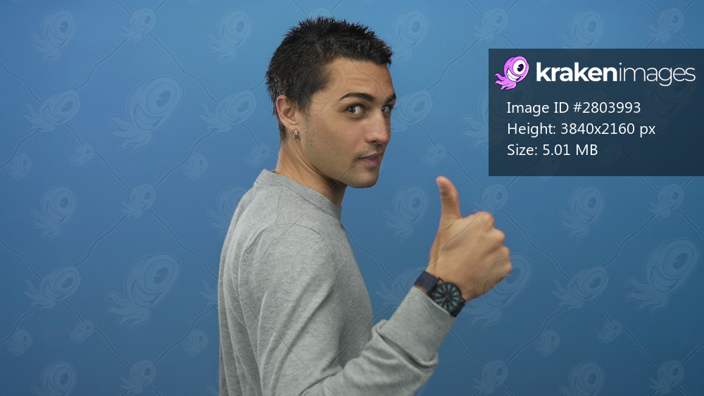 Young hispanic man gesturing thumbs up in a casual pose over isolated blue background wearing a gray sweater and watch.