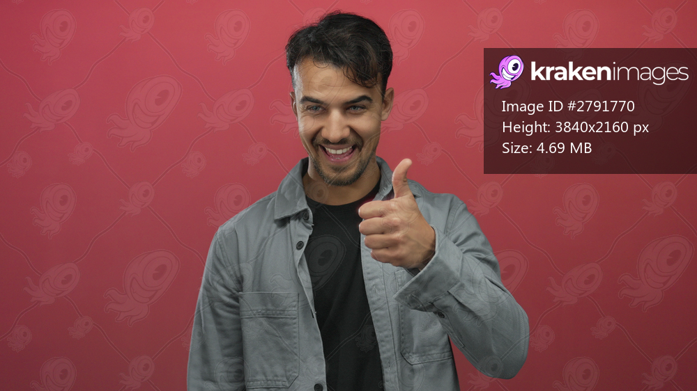 Young hispanic man giving thumbs up with a cheerful smile in front of an isolated red background showing a confident and positive gesture while wearing a casual shirt - Kraken Images