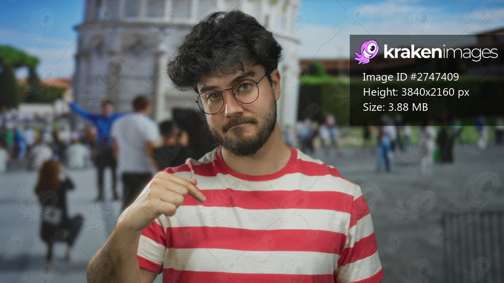 Young hispanic man with glasses and beard gestures pointing down in front of pisa tower on a sunny day surrounded by tourists and architecture outdoors in italy. - Kraken Images