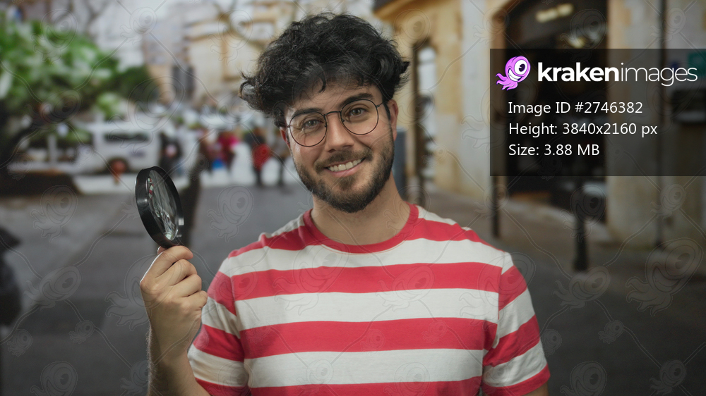 Young hispanic man with glasses and beard holding magnifying glass on a street, wearing a red striped shirt, exploring outdoors in a casual urban environment. - Kraken Images