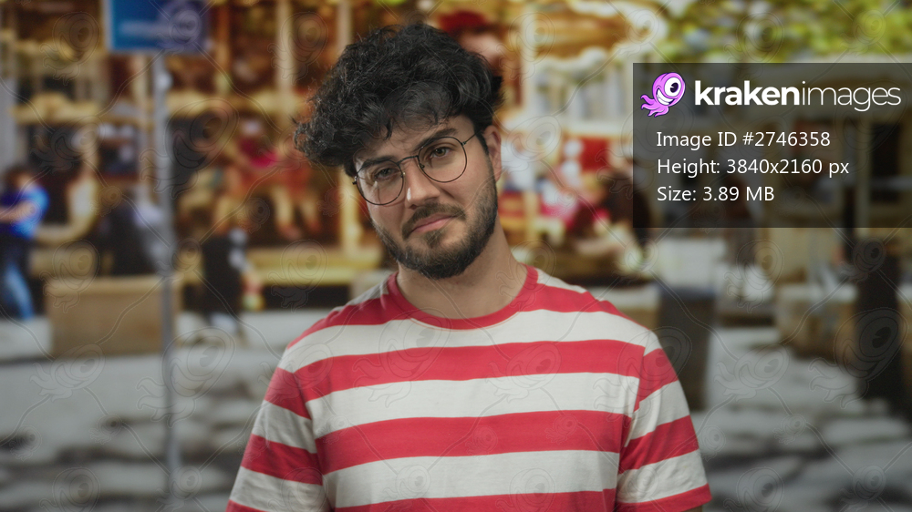 Young hispanic man with glasses and beard in street setting wearing red white striped shirt looking sad outdoors with blurred urban background.