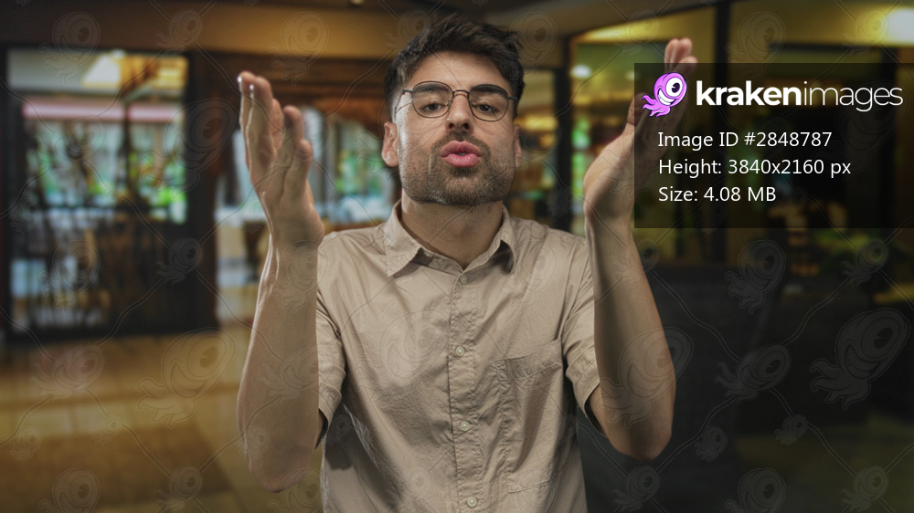Young hispanic man with glasses and beige shirt blows kiss with hand in hotel building; romantic affection.