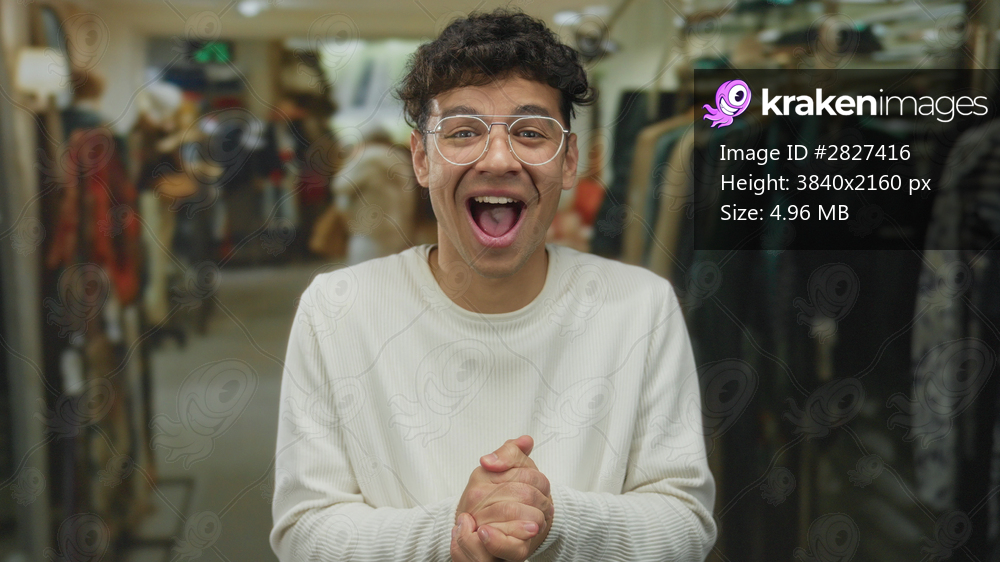 Young hispanic man with glasses clasping hands laughing in a retail building aisle under warm lights; joy.
