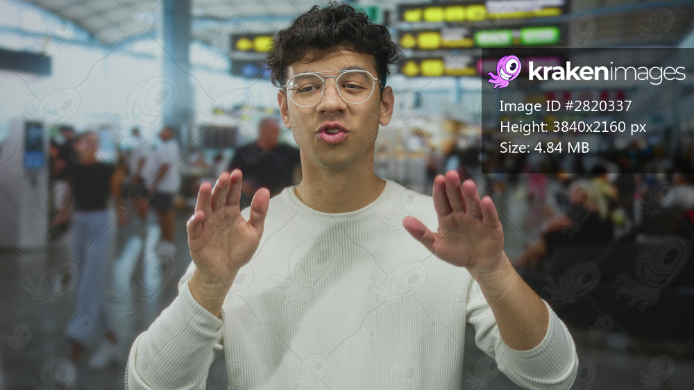 Young hispanic man with glasses holds bare hands palm down making calm gesture in airport terminal; calm.