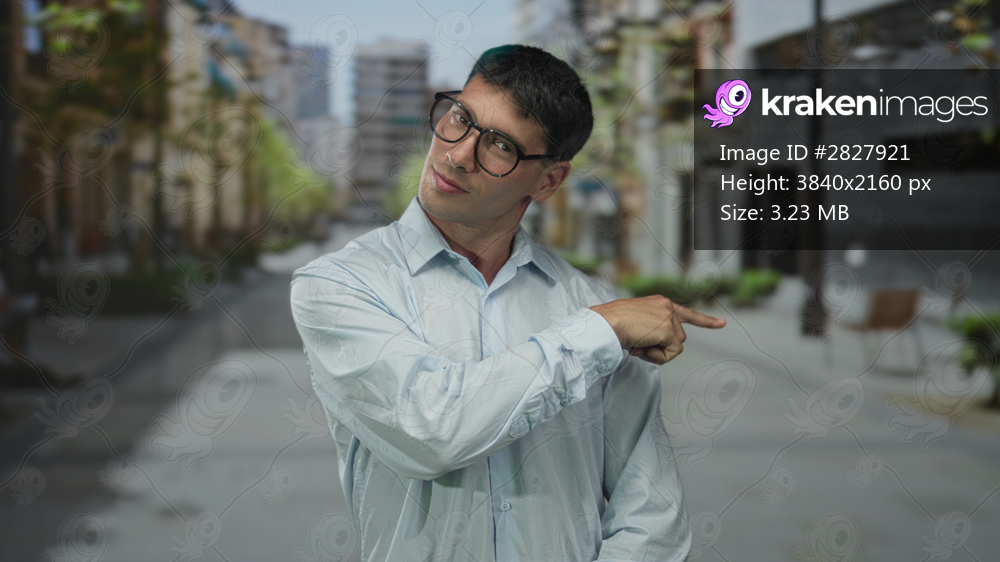 Young hispanic man with glasses pointing finger on bustling sunlit city street flanked by tall buildings; decision confidence.