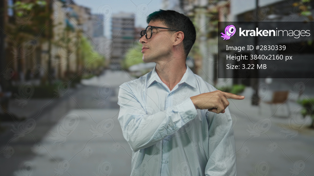 Young hispanic man with glasses pointing finger on bustling sunlit city street flanked by tall buildings; decision confidence.