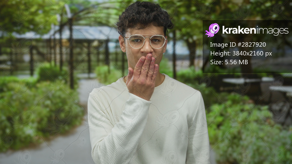 Young hispanic man with glasses smiles gently along a green park pathway under a tree canopy; serenity.