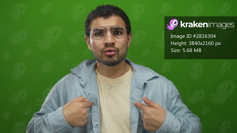 Young hispanic man with glasses strikes assertive pose and points finger to chest in a bright green studio setting; pride identity boldness assertion.