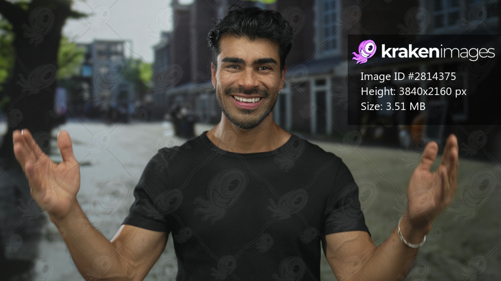 Young hispanic man grinning while raising open palms wide to show a large gap on street wearing a black shirt; confidence.