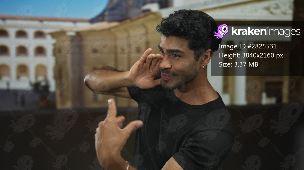 Young hispanic man with hand cupped to mouth calls out outdoors in front of building; announcement excitement.