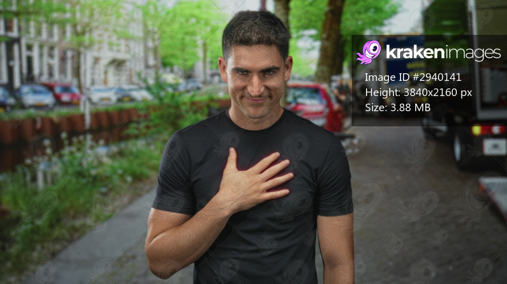 Young hispanic man with hand on chest on a cobblestone city street, wearing black tshirt, slight smile and steady eye contact; gratitude.